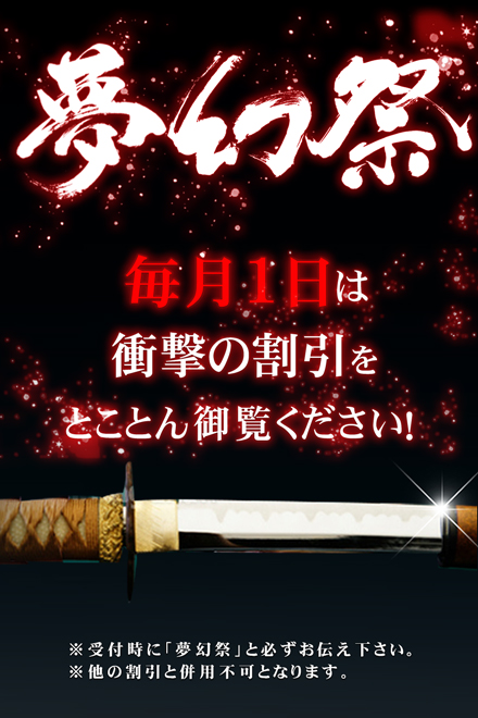 【夢幻祭】はお客様に日頃からの感謝の気持ちを込めると共に月の始まりを気持ちよくスタートして頂く為に毎月【1日】に衝撃の割引をご用意致しました。
