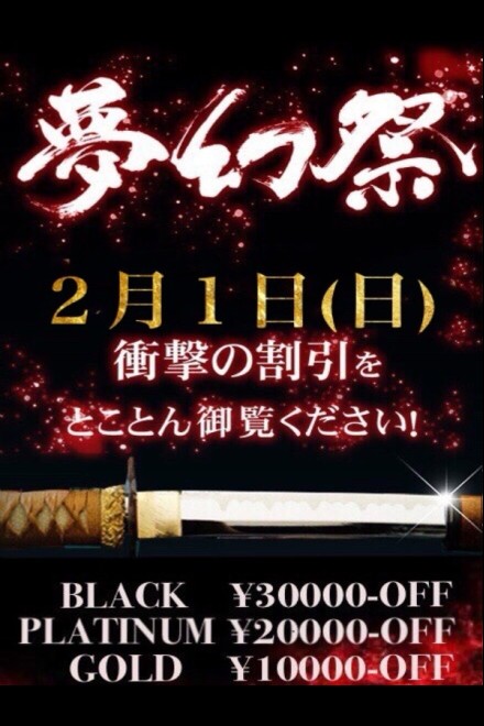 【夢幻祭】はお客様に日頃からの感謝の気持ちを込めると共に月の始まりを気持ちよくスタートして頂く為に毎月【1日】に衝撃の割引をご用意致しました。